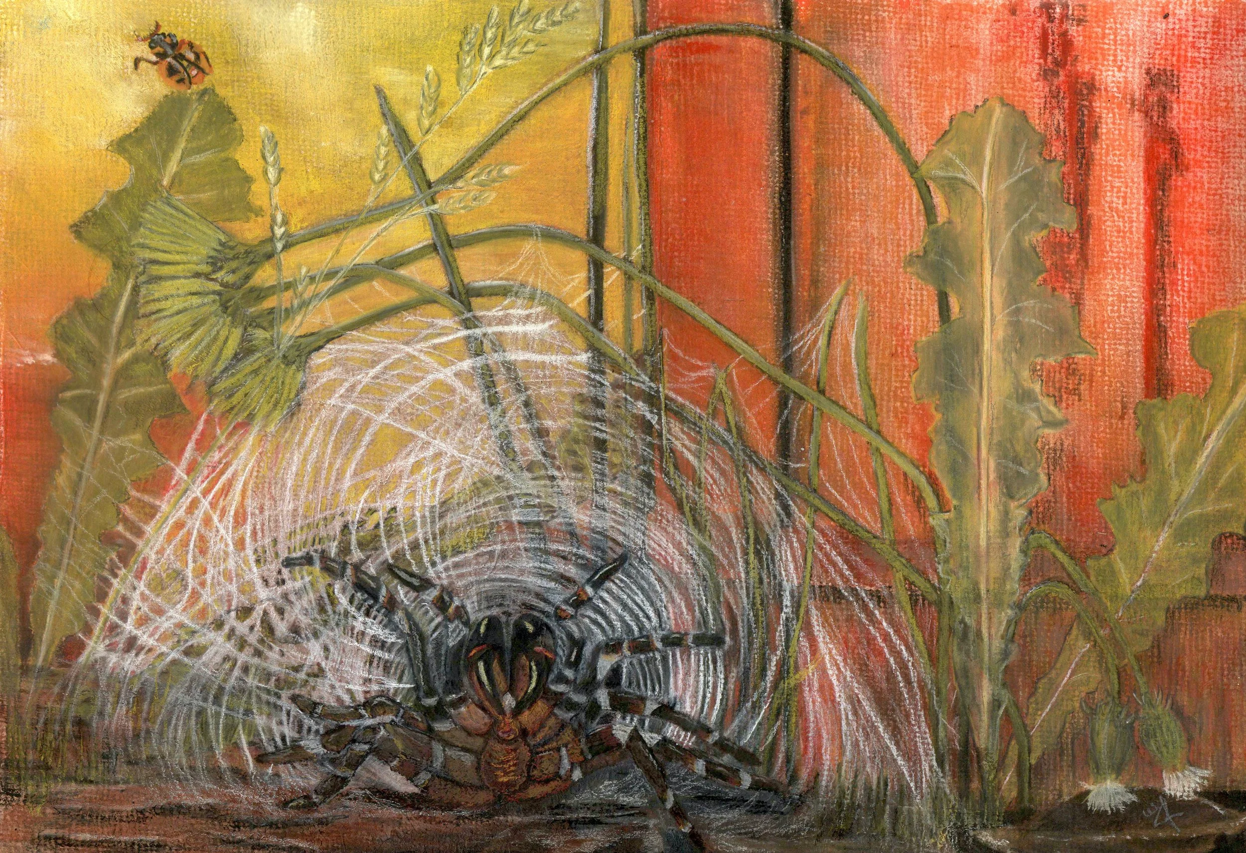 Created with soft pastels, this piece captures a familiar suburban backyard scene in New South Wales, where these spiders often make their homes.