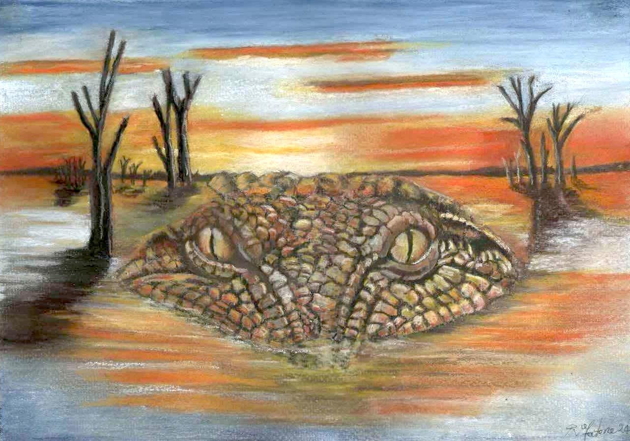 Created in soft pastel, this piece captures the stillness of an outback waterhole at sunset, where the crocodile’s form blends seamlessly into the warm reflections of the sky.